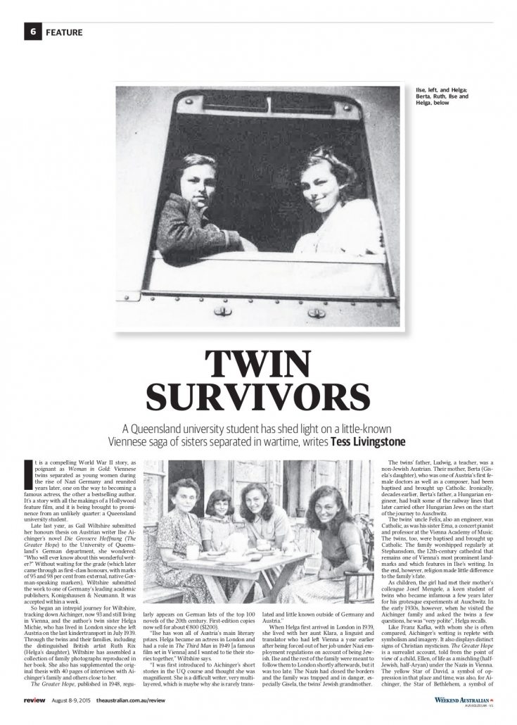After completing the thesis (which was awarded 95 and 98 per cent from external, native German-speaking markers), Wiltshire submitted it to one of Germany’s leading academic publishers, Konigshausen & Neumann. It was accepted within a week. She was driven by the fear “that no English reader body will ever know about this wonderful writer”. She was determined to lift Aichinger’s profile and to see that her work was made available internationally.