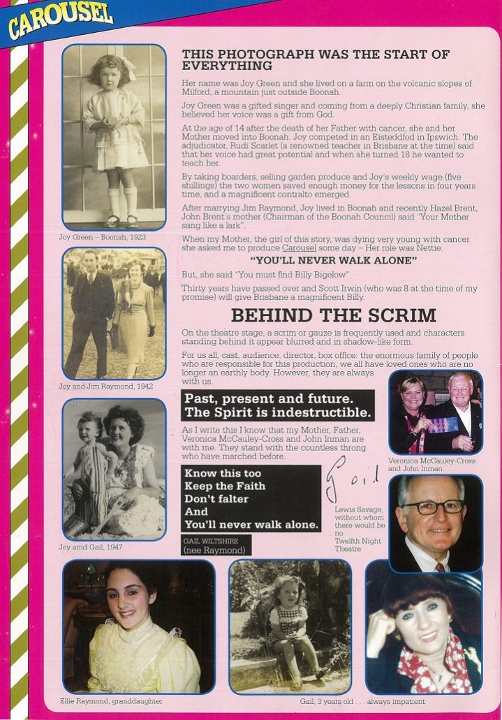 Footrot Flats, Oklahoma, Brigadoon, Guys and Dolls, Stepping Out, The Sentimental Bloke, Some Like it Hot, Half A Sixpence, Seven Brides for Seven Brothers, The Pirates of Penzance, The Mikado, Iolanthe, HMS Pinafore, South Pacific, The Blue Angel, Peter Pan, Oklahoma! Showboat, Oh! What a Lovely War, The Pyjama Game, The Desert Song, Rose-Marie, The White Horse Inn, Oliver, Annie Get Your Gun, Calamity Jane, Bye Bye Birdie, Billy Liar, Into The Woods, Les Miserables, The Snow Queen, The Silver Curlew (by Eleanor Farjeon), Finian’s Rainbow, Salad Days, I do I do, The Boyfriend